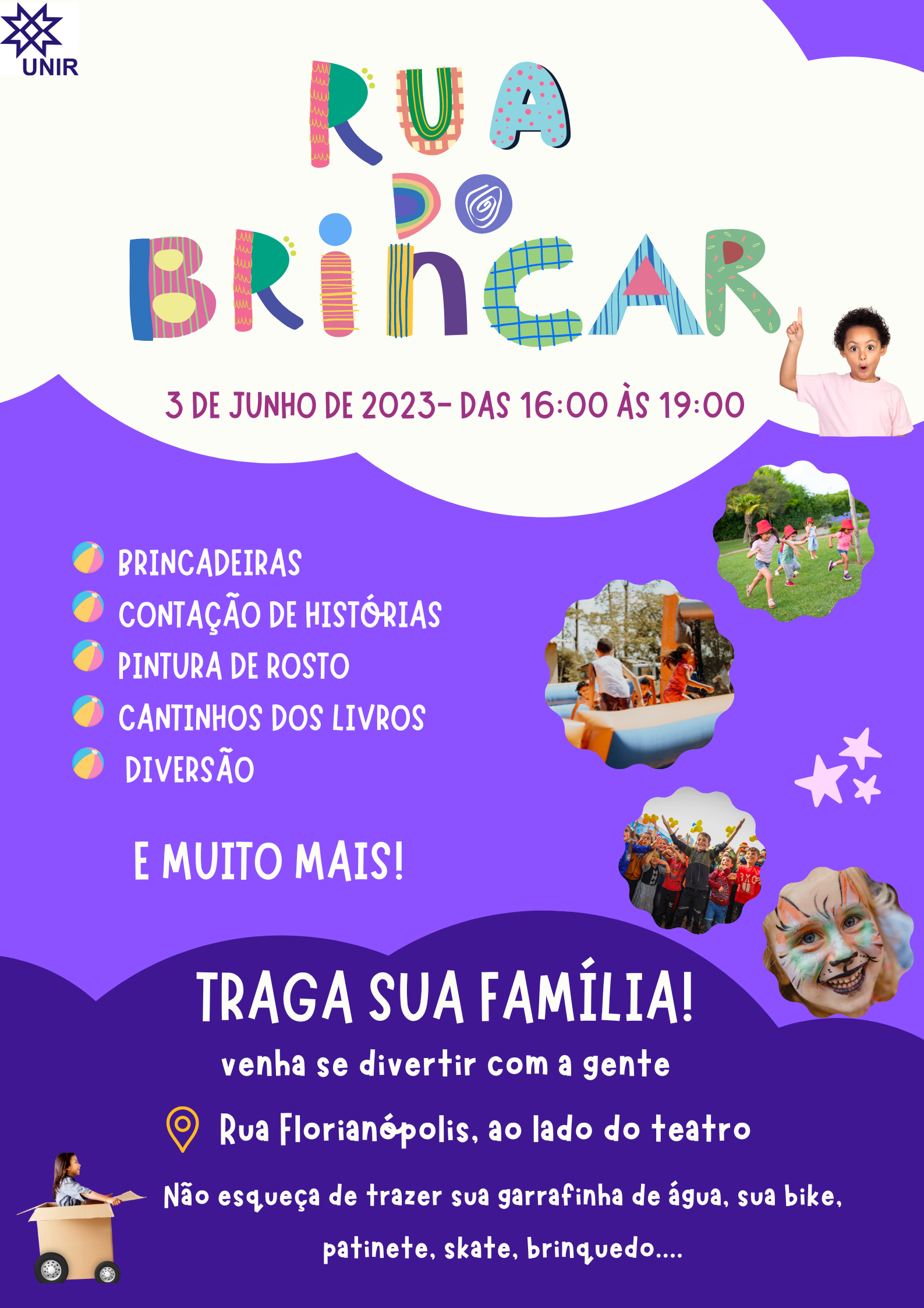 O curso de Pedagogia da UNIR/Campus Rolim de Moura promoverá, no dia 3 de junho de 2023, na rua Florianópolis, em Rolim de Moura, a primeira "Rua da Brincadeira - Rua da Leitura". Essa ação de extensão faz parte do projeto PIBEC, intitulado "Brincando em comunidade: infâncias, ludicidades e meio ambiente", que orienta as atividades da brinquedoteca Maria de Fátima de Oliveira. O projeto consiste em visitas das crianças da comunidade em geral e agendamento das escolas, além de promover a "Rua da Brincadeira - Rua da Leitura" em parceria com o Laboratório de Linguagens, Projeto Amigos da Gente e Rodas de História, que também fazem parte do PIBEC.
