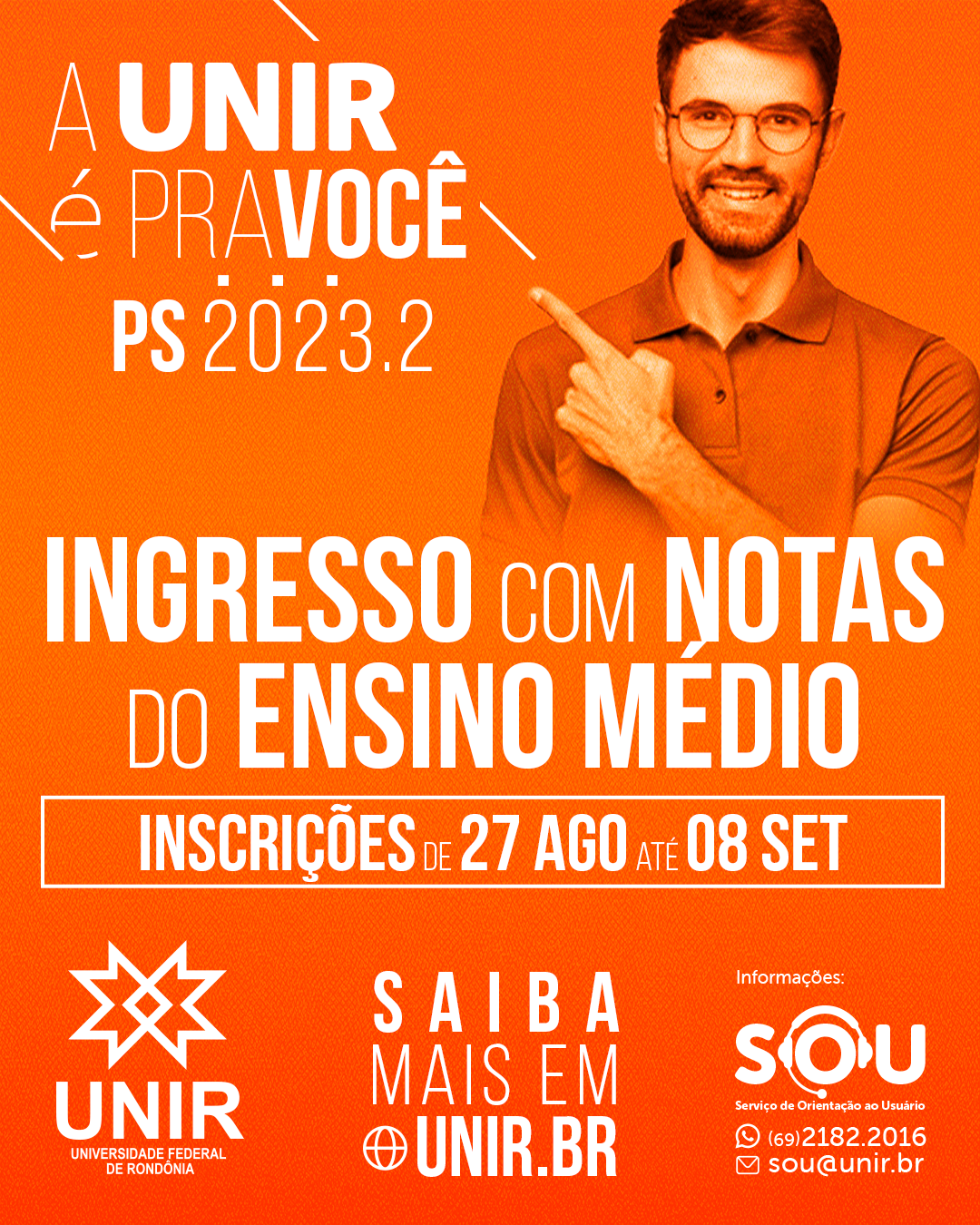 Serviço de Orientação ao Usuário – Mais informações sobre o PS UNIR 2023, e mesmo auxílios para as inscrições, podem ser obtidos por meio do Serviço de Orientação ao Usuário, o SOU UNIR. Para isso podem ser enviados e-mails para o endereço sou@unir.br ou mensagens por WhatsApp para o número (69) 2182-2016. Além disso, aqui é possível encontrar uma relação de contatos de cada uma das unidades da UNIR em que estão sendo oferecidas vagas no PS UNIR 2023.
