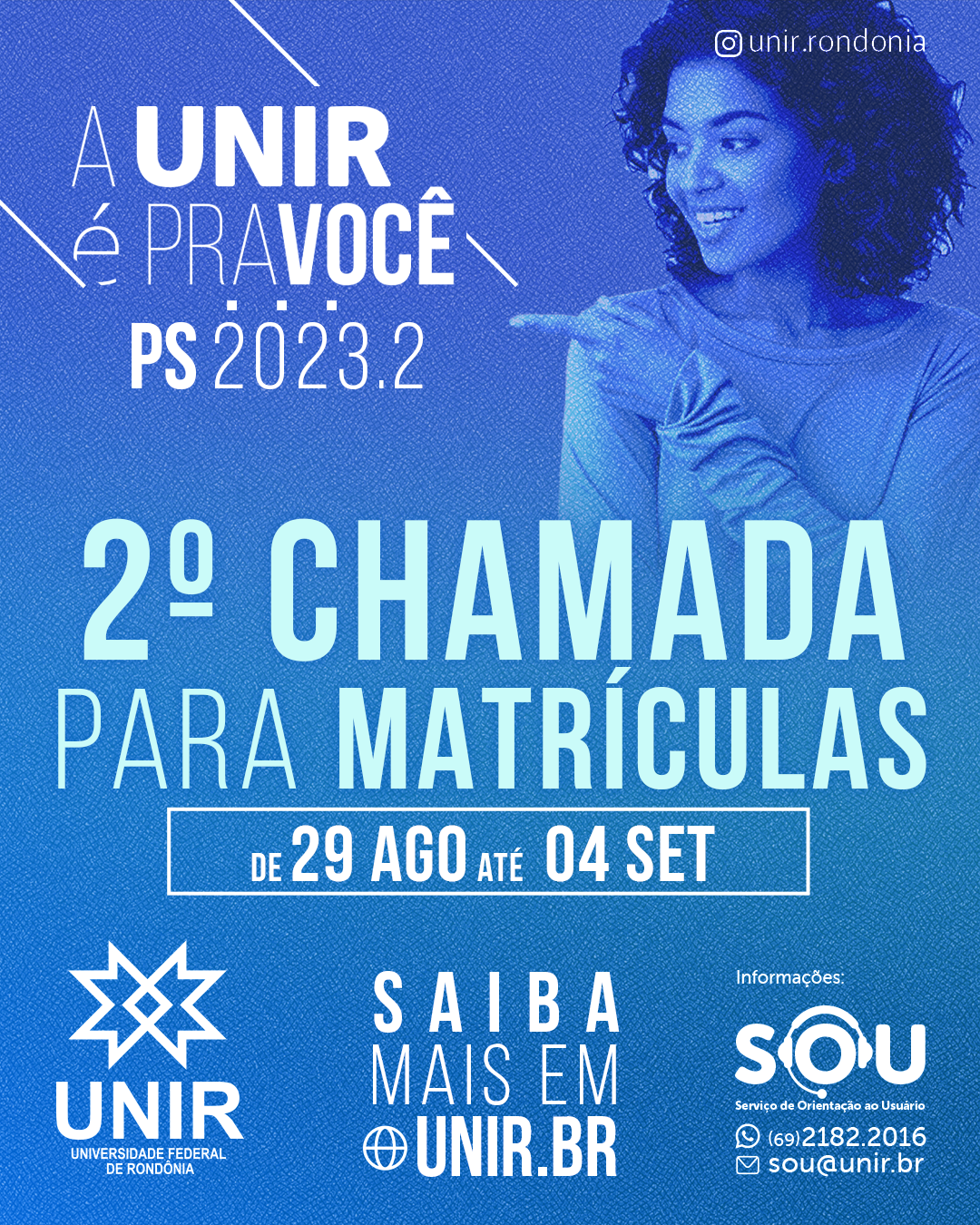 SOU-Serviço de Orientação ao Usuário – Mais informações sobre o PS UNIR 2023, e mesmo auxílios para as matrículas, podem ser obtidos por meio do Serviço de Orientação ao Usuário, o SOU UNIR. Para isso podem ser enviados e-mails para o endereço sou@unir.br ou mensagens por WhatsApp para o número (69) 2182-2016. Além disso, aqui é possível encontrar uma relação de contatos com cada uma das unidades da UNIR em que estão sendo oferecidas vagas no PS UNIR 2023.
