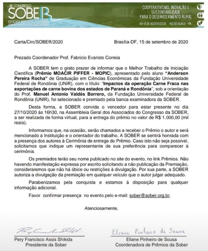 O discente Anderson Pereira Rocha, do curso de Economia da Fundação Universidade Federal de Rondônia (UNIR) foi premiado com o melhor artigo científico na área de iniciação científica do Congresso da Sociedade de Economia Administração e Sociologia Rural (SOBER). O trabalho de Anderson é resultado do projeto do Programa Institucional de Bolsas de Iniciação Científica (PIBIC) 2018/2019 da UNIR.