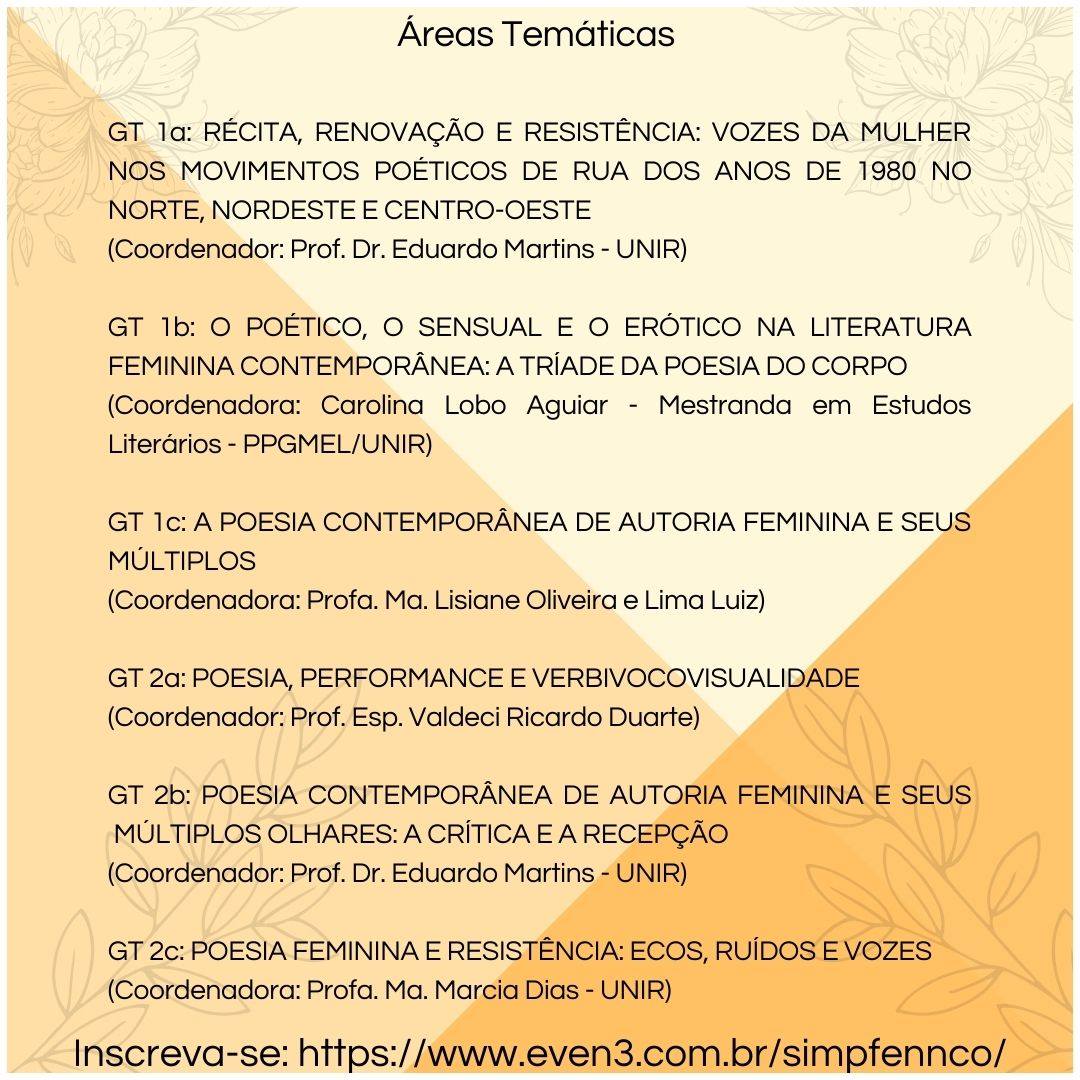 O Grupo de Pesquisa em Poesia Contemporânea de Autoria Feminina do Norte e Nordeste e Centro-Oeste (GPFENNCO) da Fundação Universidade Federal de Rondônia (UNIR) promoverá o I Simpósio de Poesia Contemporânea de Autoria Feminina do Norte, Nordeste e Centro-Oeste (SIMPFENNCO) no período de 29 a 31 de outubro, na modalidade on-line.