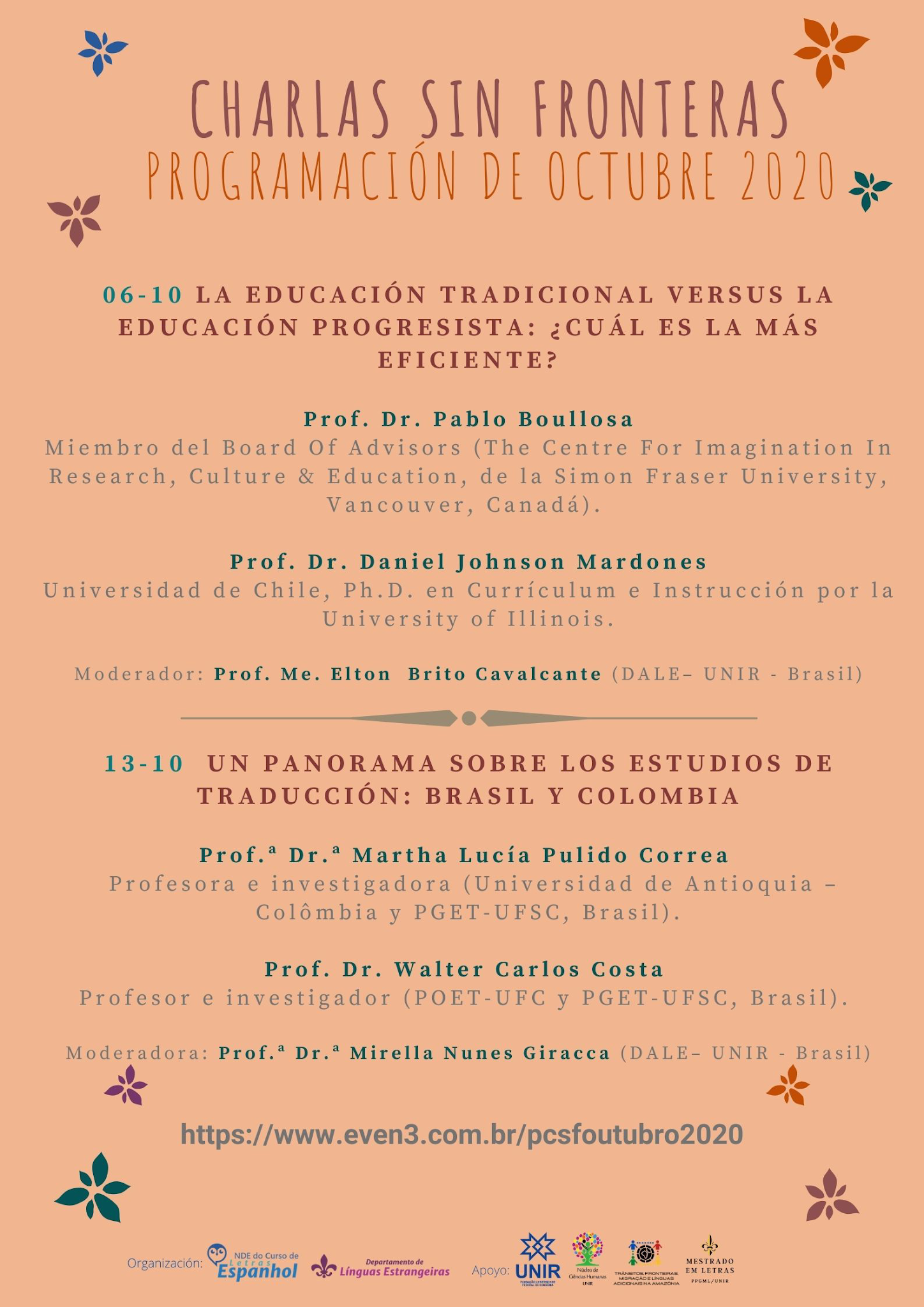 O curso de Letras-Espanhol do Departamento de Línguas Estrangeiras (DALE) da Fundação Universidade Federal de Rondônia (UNIR), por meio do Programa de Extensão "Trânsitos, Fronteiras, Migração e Línguas Adicionais na Amazônia", convida discentes, docentes e comunidade em geral para participar do Projeto CHARLAS SIN FRONTERAS na modalidade online - Edição Programação do Mês de Outubro de 2020.