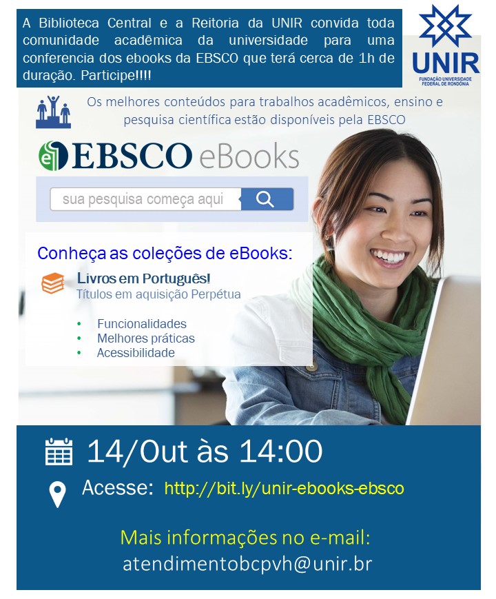 A Biblioteca Central e a Reitoria da Fundação Universidade Federal de Rondônia (UNIR) promovem para toda comunidade acadêmica da Universidade uma conferência de apresentação da plataforma de Ebooks da EBSCO.