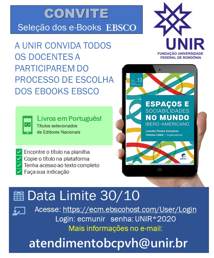 A Biblioteca Central da Fundação Universidade Federal de Rondônia (UNIR), em parceria com a EBSCO, disponibiliza à comunidade acadêmica da Instituição acesso cortesia a sua plataforma de E-books em português até o dia 30 de outubro.