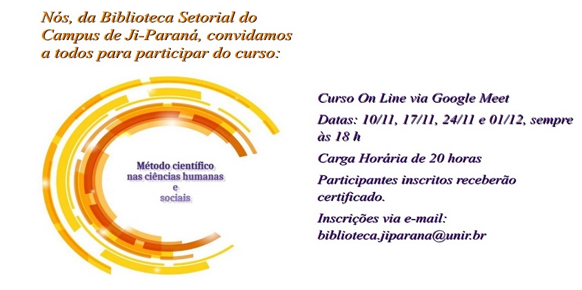 A Biblioteca Setorial do campus de Ji-Paraná da Fundação Universidade Federal de Rondônia (UNIR) abriu inscrições para o curso “Método Científico nas Ciências Humanas e Sociais”, que se iniciará no dia 10 de novembro e será desenvolvido nas terças-feiras subsequentes, dias 17, 24 de novembro e 1º de dezembro. As aulas acontecerão no período noturno, com início às 18h, por meio da plataforma Google Meet devido a pandemia da COVID-19.
