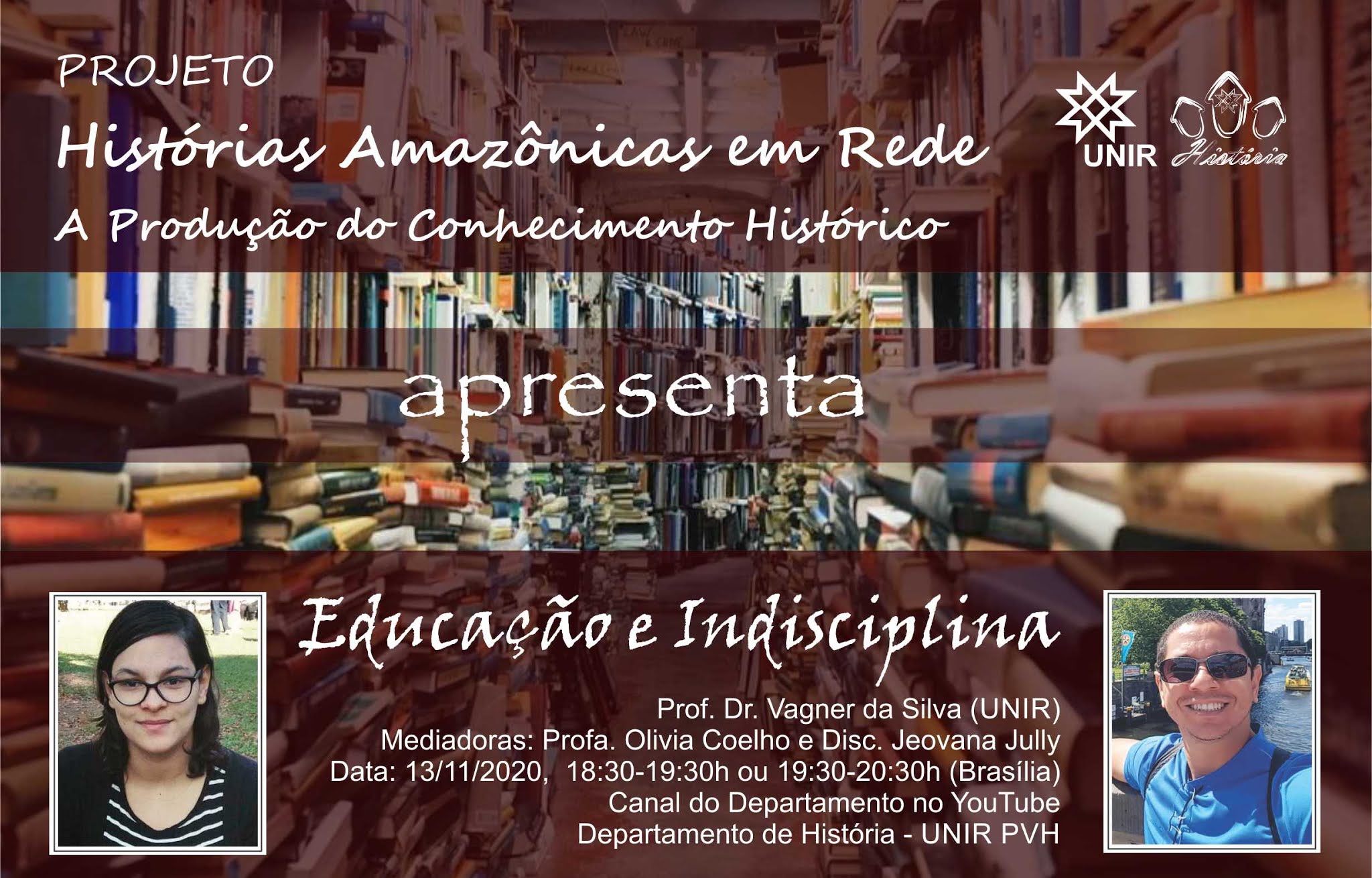 O projeto Histórias Amazônicas em Rede da Fundação Universidade Federal de Rondônia (UNIR) convida a comunidade acadêmica a participar da Live “Educação e Indisciplina”, que acontecerá nesta sexta-feira (13), às 18h30 (Horário de Rondônia). Os convidados serão o professor Vagner da Silva, do campus Porto Velho, e a doutoranda em Educação, Olívia Coelho, da Universidade Estadual de Campinas (UNICAMP).