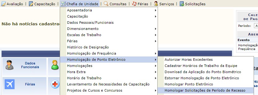 E para homologar, a chefia imediata deverá através do SIGRH clicar na aba "Chefia de Unidade", "Homologação de Ponto Eletrônico" e logo depois em " Homologar Solicitações de Período de Recesso" conforme figura abaixo: