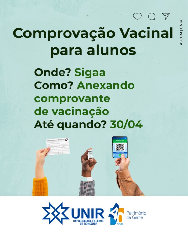 A exigência de comprovante vacinal na Universidade Federal de Rondônia (UNIR), estabelecida pelo Conselho Superior Universitário em março de 2022, passa a ter regulamentação na Instituição a partir desta semana. Estudantes e servidores da UNIR devem realizar a comprovação vacinal até o dia 30 de abril. Este prazo e outros prazos, os detalhamentos sobre os modos como a comprovação deve ser feita, e até mesmo como deve ocorrer a cedência de espaços da instituição para eventos externos, estão dispostos na Portaria 233, publicada na terça-feira, dia 19 de abril.