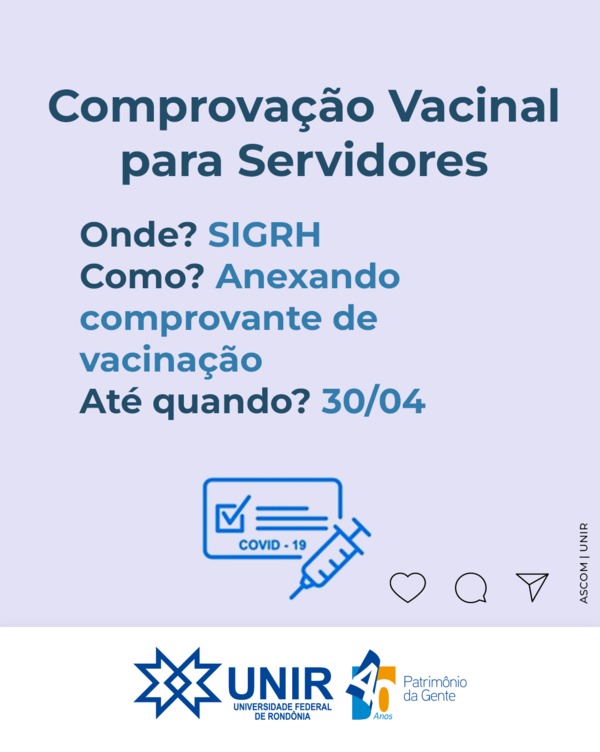 A mesma portaria ainda detalha os casos em que o comprovante vacinal não poderá ser exigido, e também traz as medidas a serem adotadas pela Universidade no caso de não comprovação e da pessoa não estar enquadrada nas exceções previstas. Além do prazo de 30 de abril para a comprovação vacinal por servidores, alunos e prestadores de serviços, também está previsto que a partir de 02 de maio em todos os eventos realizados nos espaços da UNIR será obrigatória a exigência de vacinação, o que deverá ser feito pelos organizadores das atividades.